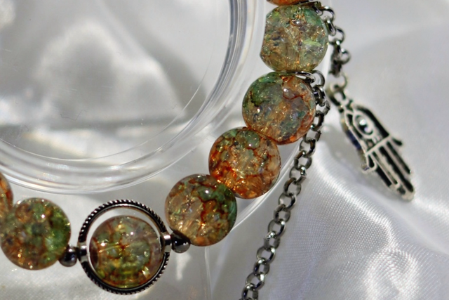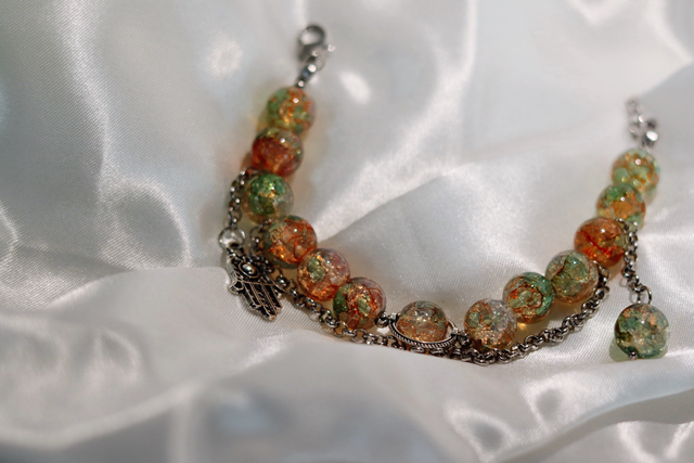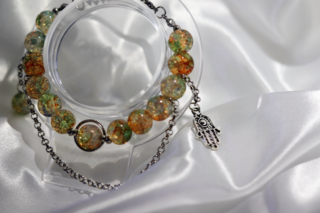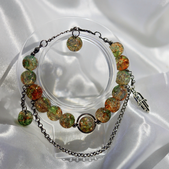 Die grün-Orange-gelben Glasperlen funkeln wie von Sonne durchflutete Waldböden, während das Hamsa-Hand-Symbol für Schutz, Glück und innere Stärke steht. Die feinen Kettendetails verleihen dem Armband einen modernen, eleganten Look – ein Begleiter für Tage, an denen du Gleichgewicht und positive Energie suchst.