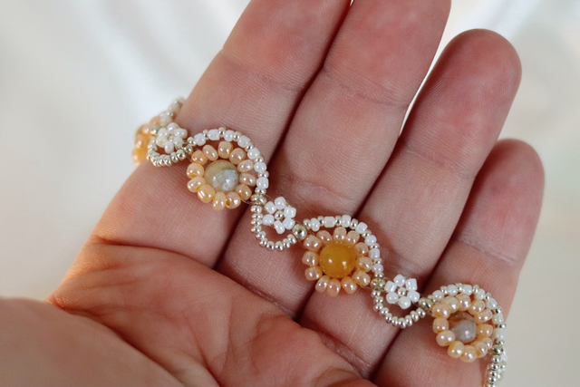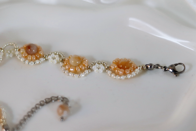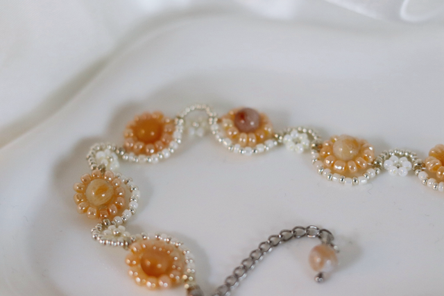 Golden Dawn vereint zarte Blütenformen aus Glasperlen und ) mit leuchtenden Bambus-Achaten in der Mitte jeder Blume. Die Kombination aus Goldgelb, Champagner und Perlweiß fängt die Stimmung eines ruhigen Sommermorgens ein – leicht, strahlend und friedlich.