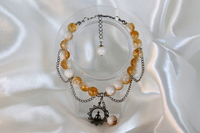 Die Kombination aus goldschimmernden und cremeweißen Glasperlen erinnert an die Wärme eines Sonnenaufgangs, während die feinen Edelstahlketten Eleganz und Stärke vereinen. Das kleine Anhänger-Symbol mit Lotus-Form und Buddha-Silhouette unterstreicht die spirituelle Note – ein Schmuckstück, das dich daran erinnert, im Jetzt zu sein und Frieden in dir selbst zu finden.