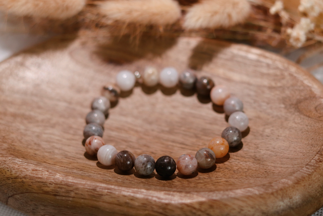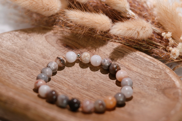 Dieses Armband besteht aus natürlich gemusterten Perlen aus Bambusachat in warmen Grau-, Beige- und Erdtönen. Die feinen Strukturen und Farbverläufe wirken ruhig, stabilisierend und zugleich beweglich – wie ein stilles Mitgehen statt starrer Widerstand.