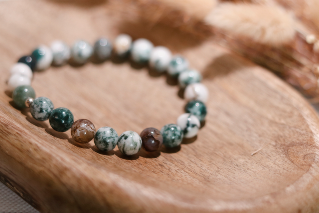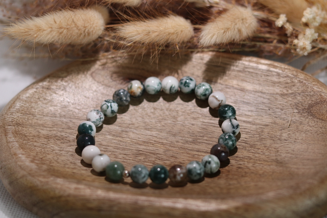 Dieses Armband besteht vollständig aus natürlich gemaserten Perlen aus Baumachat. Die Kombination aus Grün-, Weiß- und Erdtönen erinnert an Natur, Wachstum und Beständigkeit – ruhig, geerdet und ausgleichend.