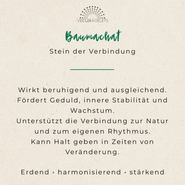 Baumachat wird traditionell als Stein gesehen, der Geduld, innere Stabilität und persönliches Wachstum fördern kann. Er gilt als unterstützend, wenn es darum geht, sich mit dem eigenen Rhythmus zu verbinden und in Zeiten von Veränderung Halt zu finden. Das schlichte Design macht das Armband zu einem unaufdringlichen Begleiter für den Alltag – naturverbunden und zeitlos.