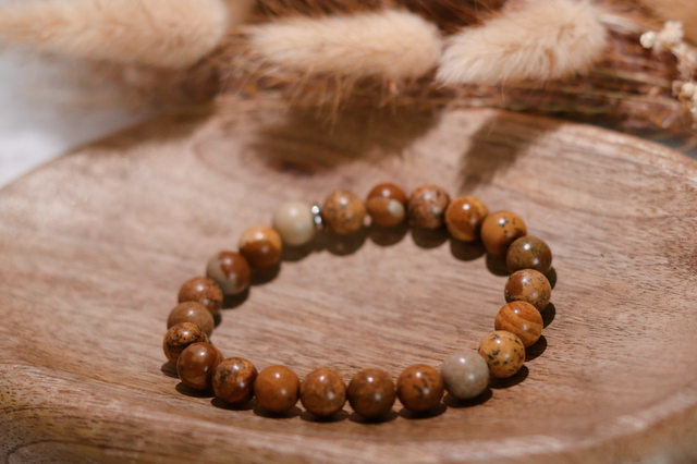 Dieses Armband besteht vollständig aus matten Perlen aus Bildjaspis und besticht durch seine warmen, erdigen Farbnuancen. Die natürlichen Muster erinnern an Landschaften und vermitteln ein Gefühl von Ausgeglichenheit und Klarheit – ruhig, zurückhaltend und zeitlos.
