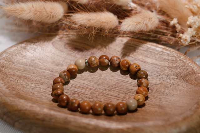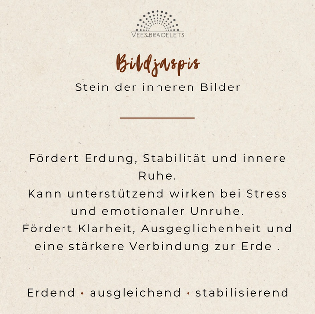 Bildjaspis wird traditionell als Stein betrachtet, der dabei unterstützen kann, in stressigen oder unruhigen Phasen einen klaren Blick zu bewahren und sich wieder stärker mit dem eigenen Inneren zu verbinden. Durch das schlichte, reduzierte Design eignet sich das Armband ideal als täglicher Begleiter.