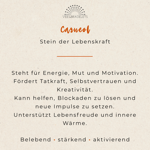 Carneol wird traditionell als Stein gesehen, der Tatkraft, Selbstvertrauen und kreative Energie fördern kann. Er gilt als unterstützend in Phasen des Neuanfangs, wenn es darum geht, innere Blockaden zu lösen und neue Impulse zu setzen. Durch das schlichte Design lässt sich das Armband sowohl im Alltag als auch als bewusster Begleiter zu besonderen Momenten tragen.